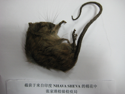 近日,張家港出入境檢驗檢疫局檢疫人員在對來自印度NHAVASHEVA港的40X40′集裝箱的棉花實施檢疫查驗過程中,發(fā)現(xiàn)箱號為APHU6488270的集裝箱內(nèi)有一只死鼠,檢疫人員根據(jù)有關(guān)應(yīng)急處置的工作要求立即關(guān)閉箱體,組織衛(wèi)生除害處理單位對該批集裝箱實施專項的除鼠、消毒處理。次日開箱查驗,在其它集裝箱內(nèi)未發(fā)現(xiàn)有死鼠。經(jīng)對該死鼠進行鑒定,確定為黃胸鼠。根據(jù)現(xiàn)場分析,該鼠很可能是在裝箱過程中進入并被困于貨物之間導致脫水死亡。