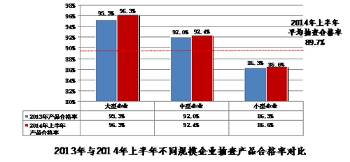 從不同規(guī)模企業(yè)抽查情況看,抽查的大、中、小型企業(yè)數(shù)分別占抽查企業(yè)總數(shù)的18%、23.6%和58.4%,抽查合格率分別為96.3%、92.4%和86.6%。與2013年相比,大、中、小型企業(yè)抽查合格率分別提高了1、0.4和0.3個百分點。抽查結(jié)果反映出各類企業(yè)質(zhì)量水平均有提升,大、中型生產(chǎn)企業(yè)產(chǎn)品質(zhì)量持續(xù)領(lǐng)先于小型企業(yè)。