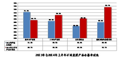 從不同類別產(chǎn)品情況看,日用消費品抽查合格率為89.2%;工業(yè)生產(chǎn)資料抽查合格率為90.3%;農(nóng)業(yè)生產(chǎn)資料抽查合格率為88.7%;建筑裝飾裝修材料產(chǎn)品抽查合格率為92.7%。工業(yè)生產(chǎn)資料、日用消費品、建筑裝飾裝修材料等3類產(chǎn)品的抽查合格率與2013年國家監(jiān)督抽查情況相比有所提高,分別提高1.9、2.4和4.7個百分點;農(nóng)業(yè)生產(chǎn)資料的抽查合格率與2013年相比下降2.5個百分點。具體情況見下圖。