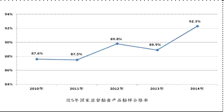 (二)全年共抽查了24245家企業(yè)生產(chǎn)的25672批次產(chǎn)品,產(chǎn)品抽查合格率為92.3%。從近5年的抽查情況看,產(chǎn)品抽查合格率分別為87.6%、87.5%、89.8%、88.9%和92.3%,整體呈現(xiàn)波動上升態(tài)勢,2014年比2013年提高了3.4個百分點,國家監(jiān)督抽查合格率首次突破90%。其中,2014年重點加強了食品相關(guān)產(chǎn)品的監(jiān)督抽查力度,全年共抽查6695家企業(yè)生產(chǎn)的7451批次產(chǎn)品,抽查合格率為98.5%,對2014年整體抽查合格率上升貢獻最大。