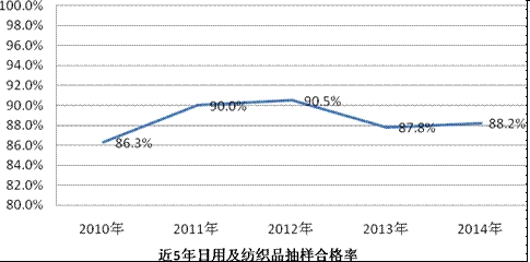 (一)日用及紡織品。全年抽查了22種2626家企業(yè)生產(chǎn)的2789批次產(chǎn)品,抽查合格率為88.2%,比2013年提高了0.4個百分點。其中,羊絨針織品、塑膠玩具2種產(chǎn)品的抽查合格率為100%;床上用品、運動服裝及針織泳裝、絮用纖維制品(枕頭、被子)、旅游鞋、休閑服裝、女式內(nèi)衣、學(xué)生用品、玩具、童車9種產(chǎn)品的抽查合格率在90%以上;羊絨針織服裝、休閑服裝(機織)、旅行箱包、背提包、毛絨布制玩具5種產(chǎn)品抽查合格率不到80%。