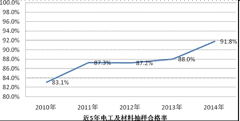 (五)電工及材料。全年抽查了21種2986家企業(yè)生產(chǎn)的3259批次產(chǎn)品,抽查合格率為91.8%,比2013年提高了3.8個百分點。其中,軸承鋼材、液化石油氣、海綿鈦3種產(chǎn)品的抽查合格率為100%;稀土氧化物、鎂碳磚、電動工具(電鉆、電錘)、電力電纜、永磁直流電動機、鉛酸蓄電池、電纜電線7種產(chǎn)品抽查合格率均高于90%;移動式插座、三相異步電動機、滾動軸承、電力變壓器、復(fù)合外套無間隙金屬氧化物、器具開關(guān)6種產(chǎn)品的抽查合格率不到80%。