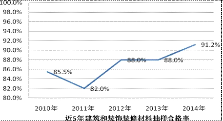 (六)建筑裝飾裝修材料。全年抽查了28種4015家企業(yè)生產(chǎn)的4030批次產(chǎn)品,抽查合格率為91.2%,比2013年提高了3.2個百分點。其中,預(yù)應(yīng)力混凝土用鋼絞線的抽查合格率為100%;鋼管、合成樹脂乳液內(nèi)墻涂料、鋼筋混凝土用熱軋帶肋鋼筋、建筑防水卷材、實木地板、絕熱用模塑聚苯乙烯泡沫塑料、無規(guī)共聚聚丙烯(PP-R)管材、平板玻璃、膠合板、刨花板、細(xì)木工板、陶瓷坐便器、溶劑型木器涂料、天然石材、纖維板、浸漬紙層壓木質(zhì)地板16種產(chǎn)品抽查合格率均高于90%;拼塊地毯、太陽能光伏組件用減反射膜玻璃2種產(chǎn)品的抽查合格率不到80%。