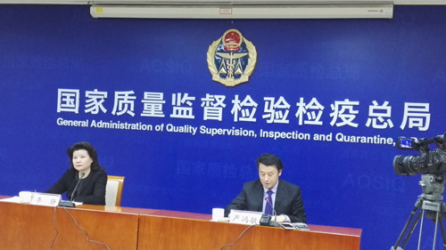 (圖為質(zhì)檢總局新聞發(fā)言人李靜和執(zhí)法督查司司長(zhǎng)嚴(yán)馮敏作新聞發(fā)布。)