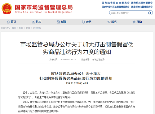 中國質(zhì)量新聞網(wǎng)訊 據(jù)國家市場監(jiān)督管理總局官網(wǎng)8月2日消息,市場監(jiān)管總局辦公廳發(fā)布《關(guān)于加大打擊制售假冒偽劣商品違法行為力度的通知》,要求在2018年度相關(guān)專項(xiàng)行動(dòng)中,將打擊包括“傍名牌”在內(nèi)的制售假冒偽劣商品、其他商標(biāo)侵權(quán)、相關(guān)虛假宣傳和違法廣告等違法行為,列為重點(diǎn)打擊目標(biāo)。發(fā)現(xiàn)的涉嫌重大違法線索,要對生產(chǎn)、銷售等相關(guān)環(huán)節(jié)進(jìn)行全鏈條調(diào)查處理。各地監(jiān)管部門可從調(diào)查網(wǎng)絡(luò)交易平臺(網(wǎng)站)入手,進(jìn)一步發(fā)現(xiàn)上、下游涉嫌違法生產(chǎn)經(jīng)營者,并將違法線索及時(shí)移送相關(guān)屬地監(jiān)管部門。屬地監(jiān)管部門應(yīng)逐一排查,對于情況屬實(shí)的應(yīng)依法從嚴(yán)查處,并及時(shí)向社會披露。