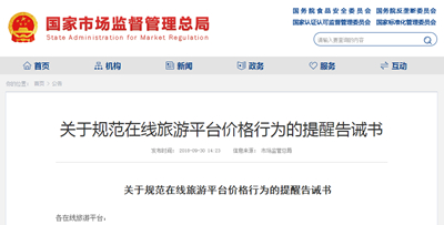 關(guān)于規(guī)范在線旅游平臺價格行為的提醒告誡書