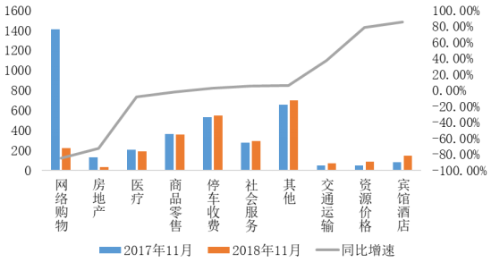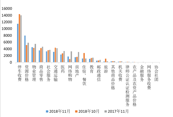 ?。ㄈ狳c(diǎn)行業(yè)分布。11月平臺(tái)受理量排名前五的行業(yè)分別是停車(chē)收費(fèi)(11478件)、資源價(jià)格(7959件)、物業(yè)管理(4521件)、商品零售(3574件)和社會(huì)服務(wù)(3264件)。從環(huán)比變化上看,資源價(jià)格、網(wǎng)絡(luò)購(gòu)物等行業(yè)受理量有所上漲,旅游、住宿餐飲等行業(yè)受理量下降明顯;從同比變化上看,資源價(jià)格、農(nóng)產(chǎn)品及農(nóng)資產(chǎn)品價(jià)格等行業(yè)受理量有所上漲,房地產(chǎn)、網(wǎng)絡(luò)購(gòu)物等行業(yè)受理量下降明顯。?