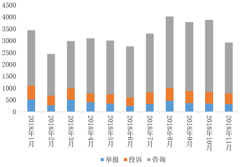 ?2018年11月,全國(guó)12358價(jià)格監(jiān)管平臺(tái)受理各類(lèi)價(jià)格舉報(bào)、投訴、咨詢(xún)共計(jì)52608件。本月,首屆中國(guó)國(guó)際進(jìn)口博覽會(huì)在上海成功舉行,“進(jìn)博會(huì)”期間上海地區(qū)市場(chǎng)價(jià)格秩序良好;“雙十一”期間網(wǎng)購(gòu)類(lèi)案件受理量逐年下降,網(wǎng)購(gòu)及快遞行業(yè)價(jià)格秩序良好;供暖價(jià)格相關(guān)案件受理量同比下降,電、氣價(jià)格問(wèn)題受到關(guān)注。