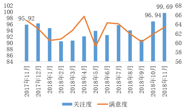 互聯(lián)網(wǎng)輿情數(shù)據(jù)分析結(jié)果顯示,2017年11月以來(lái),受全國(guó)多地區(qū)水電氣暖等領(lǐng)域改革系列舉措實(shí)施出臺(tái)影響,輿論對(duì)供暖、供電、供氣等資源價(jià)格的關(guān)注及情緒走勢(shì)呈波動(dòng)變化。2018年11月全國(guó)多地區(qū)迎來(lái)供暖期,輿論對(duì)供暖、供電、供氣等資源價(jià)格的關(guān)注度達(dá)到99.69,環(huán)比增長(zhǎng)2.84%,較2017年同期增長(zhǎng)3.93%,輿論滿(mǎn)意度環(huán)比增長(zhǎng)2.51%,同比有所下降。?