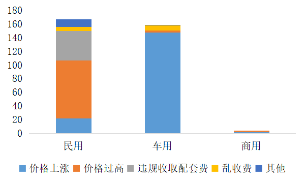 數(shù)據(jù)分析結(jié)果顯示,天然氣價(jià)格相關(guān)投訴舉報(bào)案件中,民用天然氣價(jià)格最受關(guān)注,相關(guān)投訴舉報(bào)案件共167件,占50.60%,主要反映價(jià)格上漲、價(jià)格過(guò)高和違規(guī)收取配套費(fèi)等;車(chē)用天然氣也受到較多關(guān)注,共159件,占48.18%,其中關(guān)于車(chē)用天然氣價(jià)格上漲問(wèn)題投訴較集中,共148件;此外,還有部分消費(fèi)者反映商用天然氣價(jià)格上漲、價(jià)格過(guò)高等問(wèn)題。?