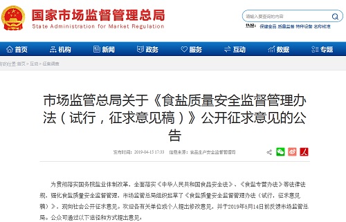 中國質(zhì)量新聞網(wǎng)訊 據(jù)國家市場監(jiān)督管理總局網(wǎng)站2019年4月15日消息,市場監(jiān)管總局組織起草的《食鹽質(zhì)量安全監(jiān)督管理辦法(試行,征求意見稿)》正向社會公開征求意見。2019年5月14日前,公眾可將意見反饋至市場監(jiān)管總局。