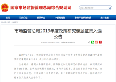 中國(guó)質(zhì)量新聞網(wǎng)訊? 2019年3月7日,市場(chǎng)監(jiān)管總局綜合規(guī)劃司公開發(fā)布《市場(chǎng)監(jiān)管總局2019年度政策研究課題征集公告》,提出15個(gè)招標(biāo)課題。