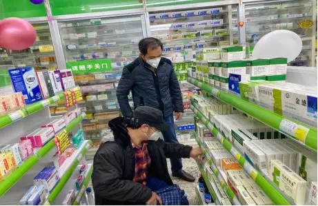 文巍(左一)在藥店檢查藥品價格