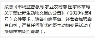 2月16日,在“禁售”行動(dòng)取得初步成果后,為進(jìn)一步加強(qiáng)網(wǎng)絡(luò)交易監(jiān)管,深圳市市場監(jiān)管局網(wǎng)絡(luò)交易監(jiān)管處電話聯(lián)系了深圳市59家電商平臺(tái)企業(yè),再次告知企業(yè)須嚴(yán)格自查、主動(dòng)下架,并通知企業(yè)簽署《關(guān)于嚴(yán)禁野生動(dòng)物及其制品交易之自查說明及承諾書》,進(jìn)一步規(guī)范平臺(tái)行為。