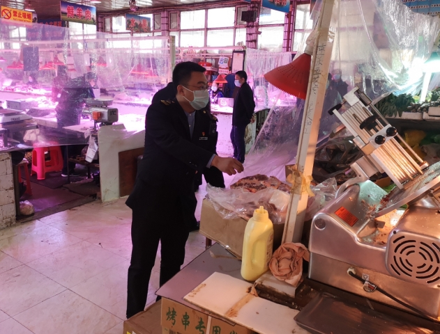 在農(nóng)貿(mào)市場(chǎng),分局派出24人對(duì)泓江市場(chǎng)、批發(fā)市場(chǎng)、升輝市場(chǎng)全天不間斷巡查督導(dǎo),重點(diǎn)檢查開辦單位落實(shí)“掃碼、測(cè)溫、戴口罩”防疫“三寶”執(zhí)行情況,檢查每日消殺、員工測(cè)溫等相關(guān)記錄記載情況。要求開辦單位加強(qiáng)市場(chǎng)管理,落實(shí)防控和食品安全主體責(zé)任,保障人民群眾健康安全。針對(duì)泓江市場(chǎng)掃碼、測(cè)溫環(huán)節(jié)存在的人員聚集問題,執(zhí)法人員要求立即設(shè)置人員“安檢”通道及隔離線,將出入口分開。通過整改,泓江市場(chǎng)銷售業(yè)戶均用塑料布進(jìn)行了隔離,有效的防止了人員聚集。