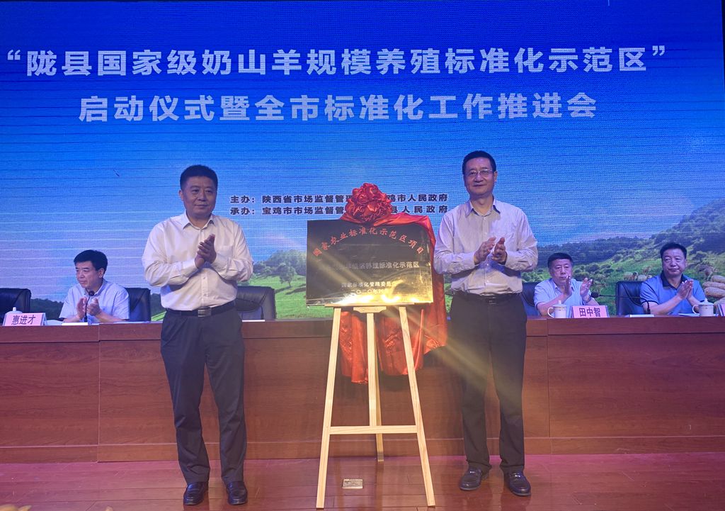 國家市場監(jiān)管總局標準技術管理司副司長徐長興、陜西省市場監(jiān)管局局長張小寧出席會議,并為國家級奶山羊規(guī)模養(yǎng)殖標準化示范區(qū)揭牌,會議由寶雞市人民政府市長惠進才主持。省市場監(jiān)管局一級巡視員田中智宣讀了國家標準委關于下達國家標準化示范試點項目的通知,寶雞市委常委、副市長時鎮(zhèn)介紹并部署全市標準化有關工作,隴縣縣委書記杜長生致辭。