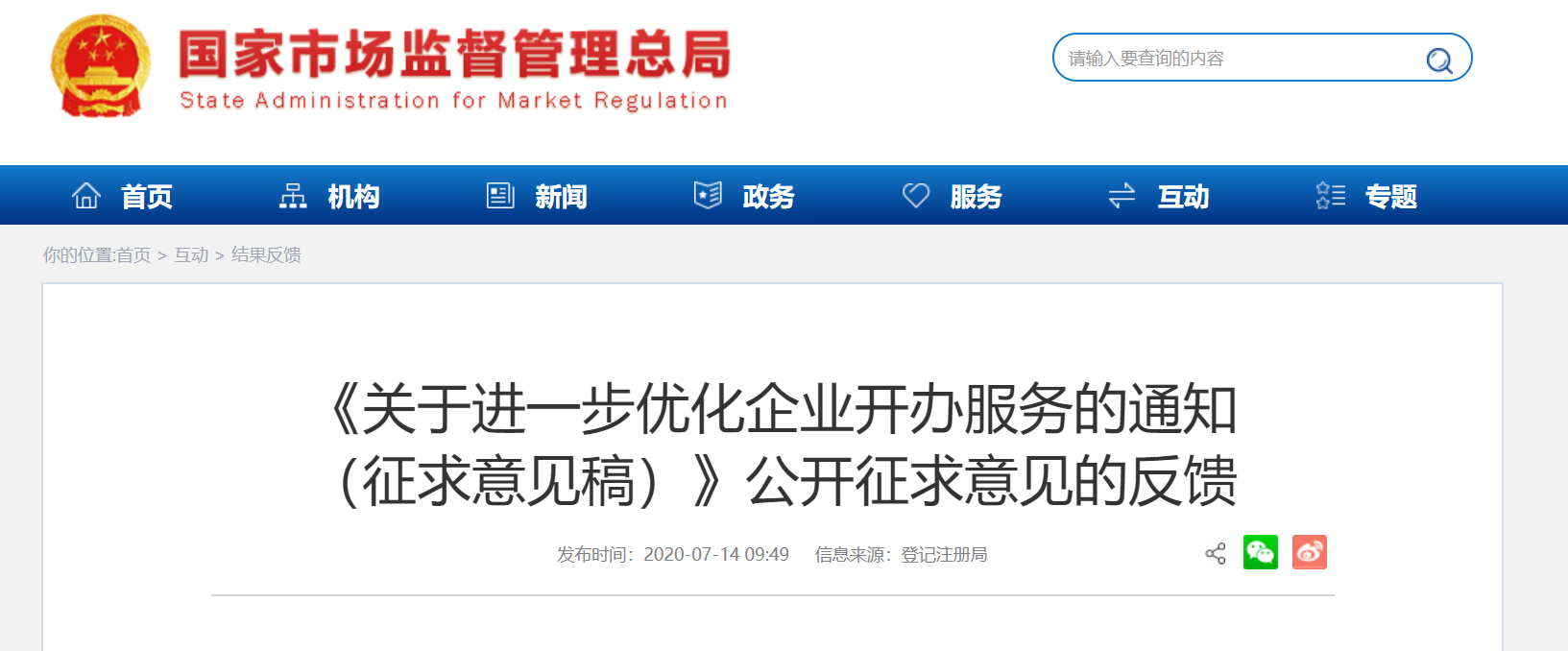 《關(guān)于進(jìn)一步優(yōu)化企業(yè)開(kāi)辦服務(wù)的通知(征求意見(jiàn)稿)》公開(kāi)征求意見(jiàn)的反饋