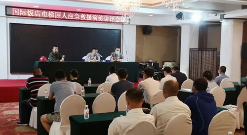 按照演練預(yù)案部署,本次演練主要分為求救、救援、電梯維護(hù)和講評四個環(huán)節(jié)。第一環(huán)節(jié)是模擬兩位乘客乘坐的電梯運行異常,于負(fù)一層至一層之間停滯無響應(yīng),乘客通過轎廂內(nèi)通訊設(shè)備聯(lián)絡(luò)賓館前臺值班人員并告知受困情況,值班人員立刻向哈爾濱上菱電梯公司求助;第二環(huán)節(jié)是哈爾濱上菱電梯公司接到飯店求救電話后第一時間派出技術(shù)人員到達(dá)現(xiàn)場,確定受困人員位置,與受困人員溝通告知救援情況并進(jìn)行情緒安撫,切斷電梯主電源、手動平層等一系列救援操作,成功解救被困人員,詢問被困人員身體狀況是否需要醫(yī)療救助;第三環(huán)節(jié)是對電梯進(jìn)行檢修、消除故障,確認(rèn)電梯可正常使用后并告知使用單位;第四環(huán)節(jié)是對演練情況進(jìn)行講評,分析演練中存在的問題,總結(jié)經(jīng)驗教訓(xùn)。
