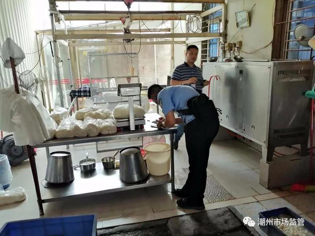 在查處該作坊的同時(shí),執(zhí)法人員將現(xiàn)場(chǎng)來(lái)自潮安區(qū)的河粉(粿條)有關(guān)情況通報(bào)給潮安區(qū)市場(chǎng)監(jiān)管局和公安局,潮安區(qū)兩部門迅速出動(dòng),對(duì)銷售河粉(俗稱粿條)給該作坊的食品廠進(jìn)行檢查,結(jié)果發(fā)現(xiàn)該食品廠也存在非法使用添加劑的嫌疑,當(dāng)即查扣涉嫌物品并抽樣送檢。