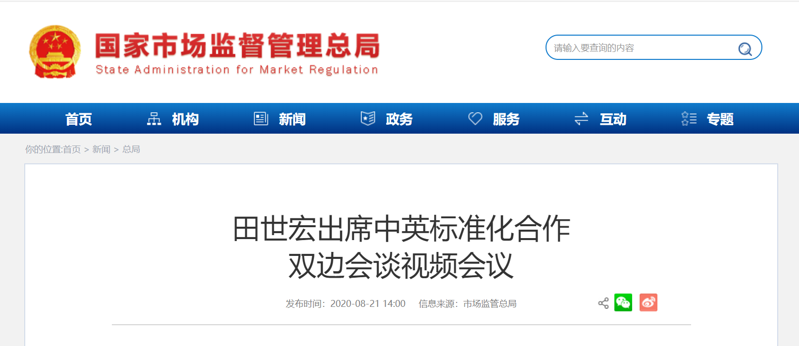 8月17日,中英標(biāo)準(zhǔn)化合作雙邊會談視頻會議在京召開,市場監(jiān)管總局副局長、國家標(biāo)準(zhǔn)委主任田世宏,英國國家標(biāo)準(zhǔn)化機(jī)構(gòu)(BSI)標(biāo)準(zhǔn)總裁斯科特·斯蒂德曼共同出席會議。