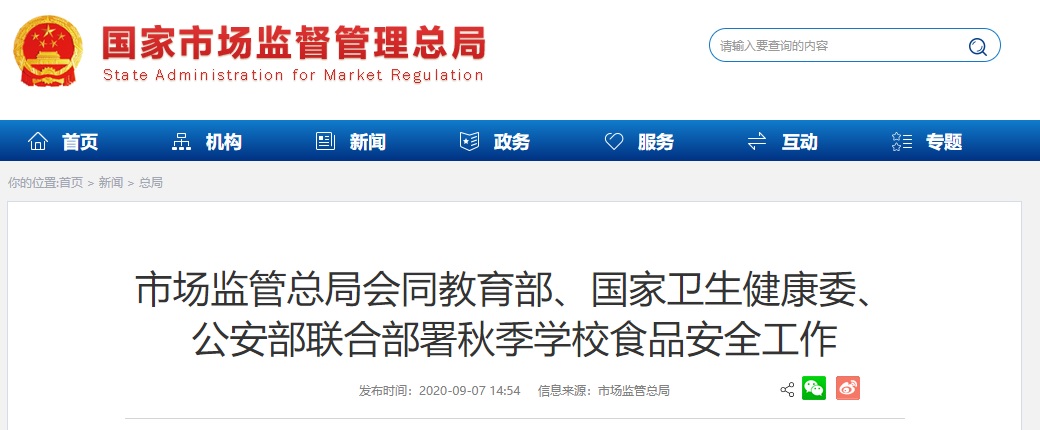 近日,市場監(jiān)管總局會同教育部、國家衛(wèi)生健康委、公安部聯(lián)合印發(fā)《關(guān)于做好秋季學(xué)校食品安全工作的通知》(以下稱《通知》),部署各地做好2020年秋季學(xué)校食品安全工作,防范學(xué)校食品安全風(fēng)險,加強(qiáng)食育教育,減少餐飲浪費(fèi)。