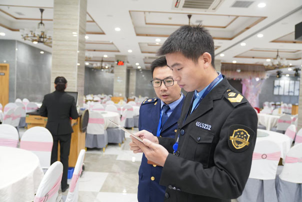 圖為檢查人員在餐飲企業(yè)檢查,檢查數(shù)據(jù)當(dāng)場(chǎng)錄入電子監(jiān)管系統(tǒng)