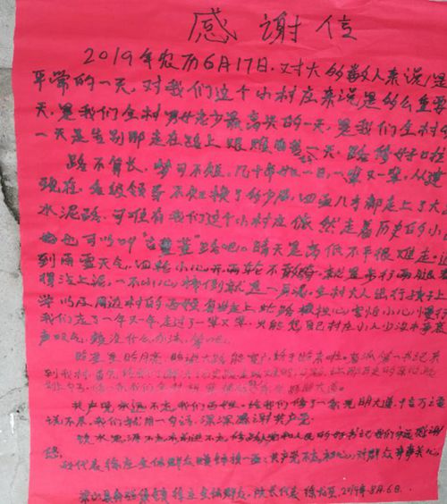 村民自發(fā)制作的感謝錦旗和感謝信