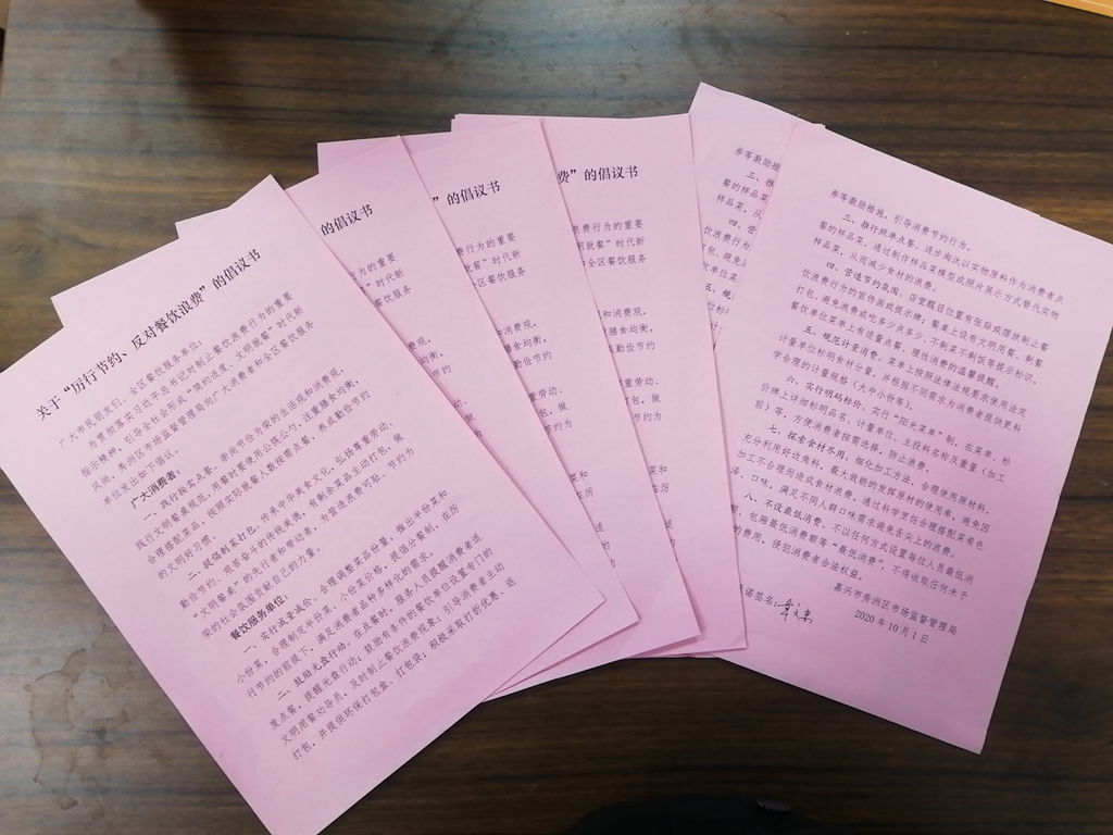 二是發(fā)起倡議,營造氛圍。向轄區(qū)內(nèi)餐飲服務(wù)單位和廣大消費者發(fā)出“厲行節(jié)約、反對餐飲浪費”倡議書,明確餐飲服務(wù)單位和消費者可踐行行為,營造節(jié)約良好氛圍。