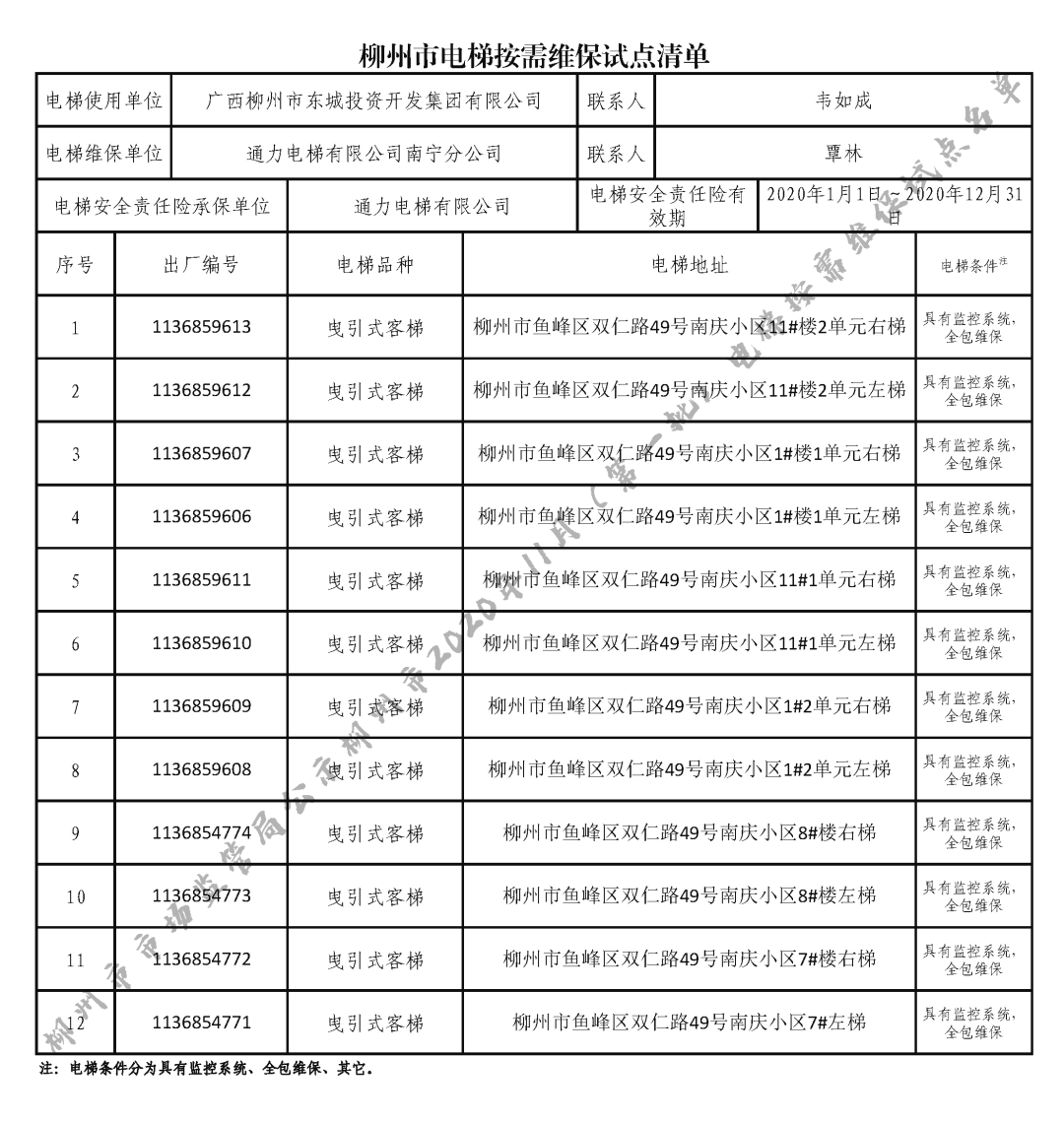 柳州市2020年11月(第一批)電梯按需維保試點名單如下: