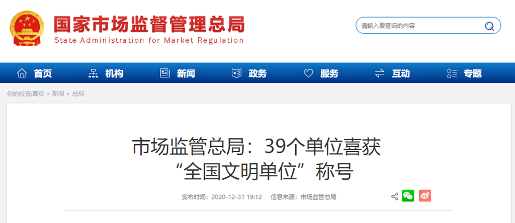 2020年11月20日,全國精神文明建設(shè)表彰大會(huì)在北京舉行。市場監(jiān)管系統(tǒng)39個(gè)單位獲得第六屆“全國文明單位”稱號(hào)。同時(shí),市場監(jiān)管系統(tǒng)另有50個(gè)單位通過了復(fù)查,繼續(xù)保留“全國文明單位”榮譽(yù)稱號(hào)。