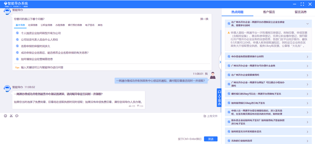 首創(chuàng)一鍵智慧導(dǎo)辦服務(wù)。站在企業(yè)角度換位思考,全面梳理、歸集開辦企業(yè)各項業(yè)務(wù)辦理要求、材料、流程,使申請人在一網(wǎng)通平臺填報每一個數(shù)據(jù)項,都能夠隨時一鍵獲取智慧導(dǎo)辦服務(wù)和實景模擬填報指引視頻,通過平臺智能推薦的點選卡片或自由提問方式,自助獲取圖文指引快捷解決辦理疑難問題。