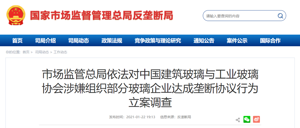近日,市場監(jiān)管總局根據(jù)舉報,依法對中國建筑玻璃與工業(yè)玻璃協(xié)會涉嫌組織部分玻璃企業(yè)達成壟斷協(xié)議行為立案調(diào)查。