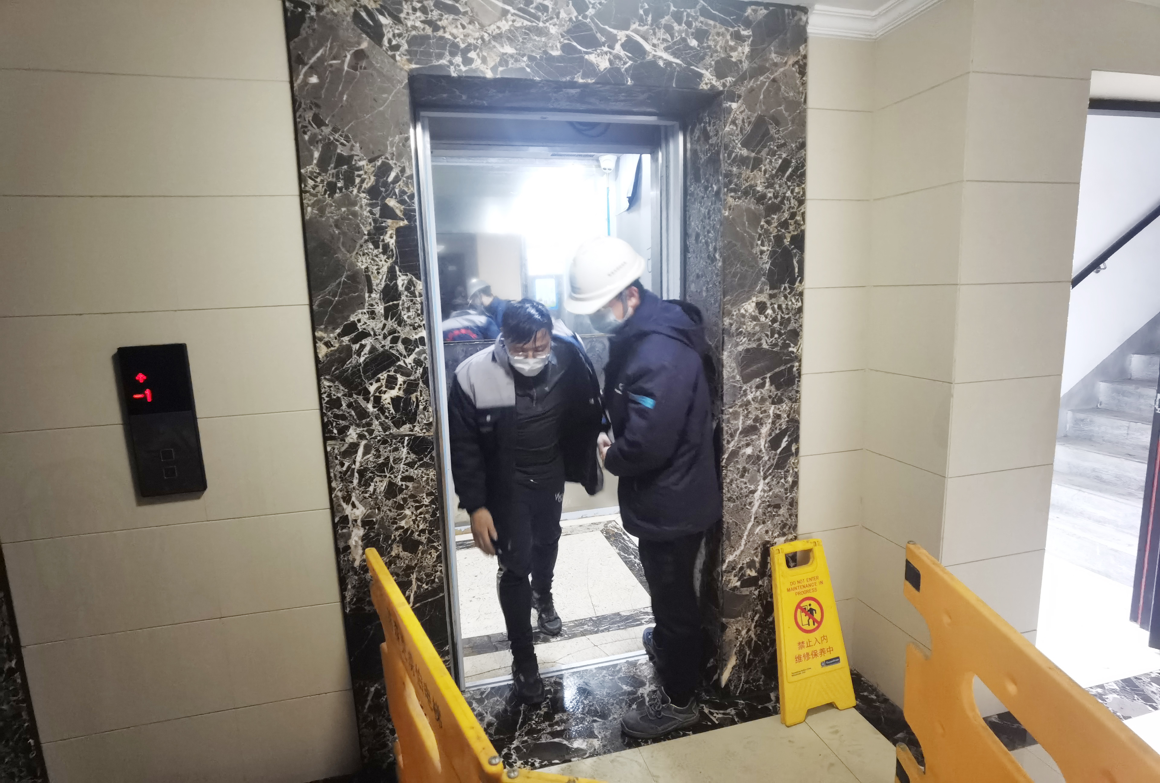 (打開(kāi)轎門后,救援人員協(xié)助乘客離開(kāi)轎廂,并再次安撫受驚嚇乘客)