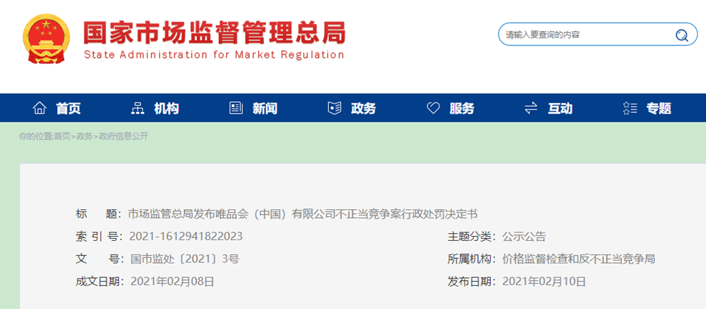 2021年2月8日,市場監(jiān)管總局對唯品會(中國)有限公司不正當競爭違法行為作出行政處罰決定?,F(xiàn)將行政處罰決定書予以公告。