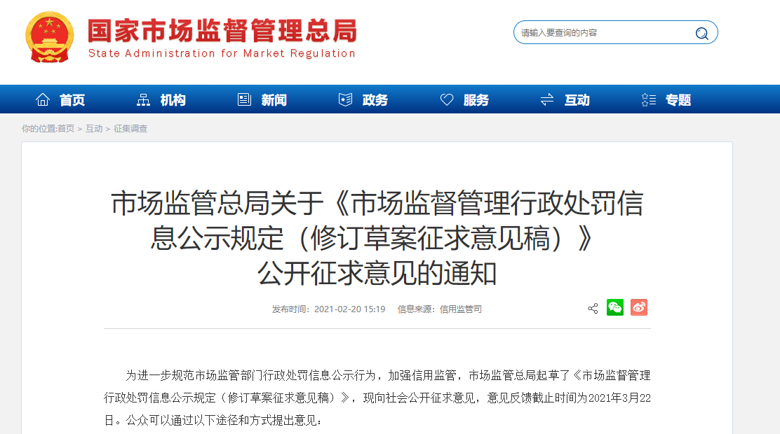 為進(jìn)一步規(guī)范市場(chǎng)監(jiān)管部門行政處罰信息公示行為,加強(qiáng)信用監(jiān)管,市場(chǎng)監(jiān)管總局起草了《市場(chǎng)監(jiān)督管理行政處罰信息公示規(guī)定(修訂草案征求意見稿)》,現(xiàn)向社會(huì)公開征求意見,意見反饋截止時(shí)間為2021年3月22日。公眾可以通過以下途徑和方式提出意見: