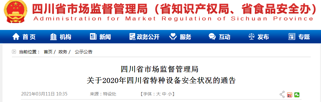 中國質(zhì)量新聞網(wǎng)訊 2021年3月11日,四川省市場監(jiān)督管理局網(wǎng)站通告2020年四川省特種設(shè)備安全狀況。2020年四川省共發(fā)生特種設(shè)備一般事故2起,死亡2人。同比2019年,事故數(shù)量持平,萬臺特種設(shè)備死亡率為0.03,全年未發(fā)生特種設(shè)備重特大事故,特種設(shè)備安全形勢總體平穩(wěn)。