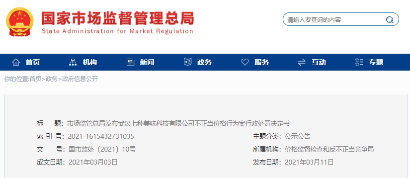 2021年3月3日,市場監(jiān)管總局對武漢七種美味科技有限公司不正當價格行為案作出行政處罰決定,現(xiàn)將行政處罰決定書予以公告。