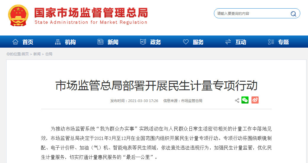 為推動市場監(jiān)管系統(tǒng)“我為群眾辦實事”實踐活動在與人民群眾日常生活密切相關(guān)的計量工作中落地見效,市場監(jiān)管總局決定于2021年3月至12月在全國范圍內(nèi)組織開展民生計量專項行動。專項行動將圍繞眼鏡制配、電子計價秤、加油(氣)機(jī)、智能電表等民生領(lǐng)域,依法查處違法違規(guī)行為,加強(qiáng)民生計量監(jiān)管,優(yōu)化民生計量服務(wù),切實打通計量惠民服務(wù)的“最后一公里”。