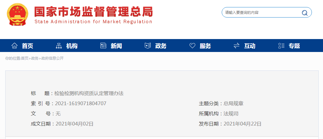 第四條 國家市場監(jiān)督管理總局(以下簡稱市場監(jiān)管總局)主管全國檢驗(yàn)檢測機(jī)構(gòu)資質(zhì)認(rèn)定工作,并負(fù)責(zé)檢驗(yàn)檢測機(jī)構(gòu)資質(zhì)認(rèn)定的統(tǒng)一管理、組織實(shí)施、綜合協(xié)調(diào)工作。
