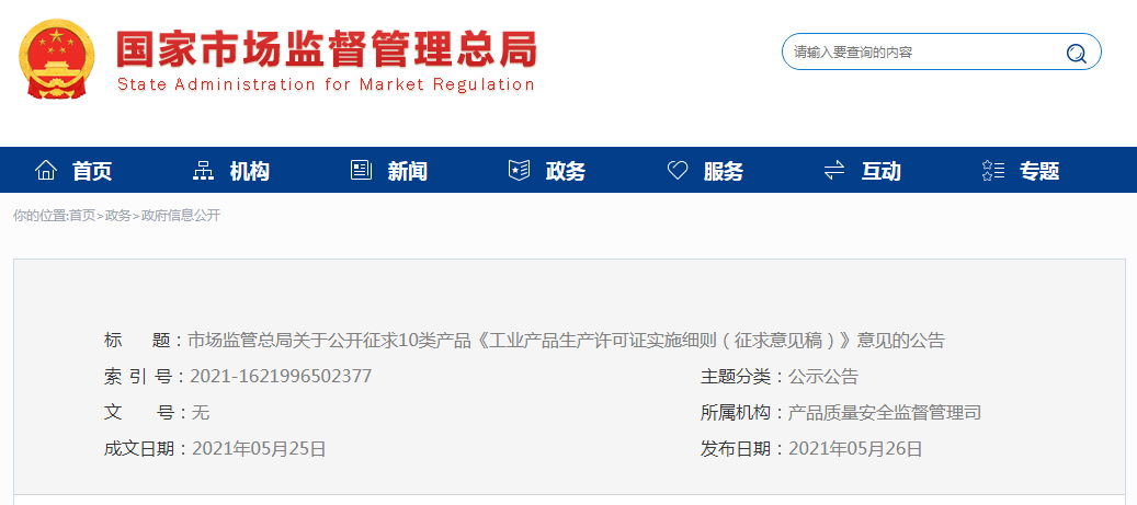 市場(chǎng)監(jiān)管總局關(guān)于公開征求10類產(chǎn)品《工業(yè)產(chǎn)品生產(chǎn)許可證實(shí)施細(xì)則(征求意見稿)》意見的公告