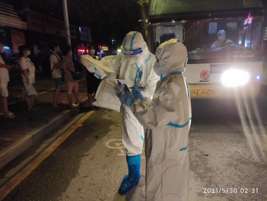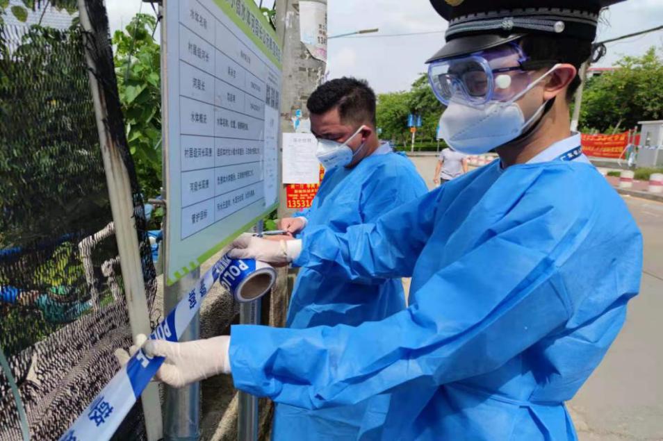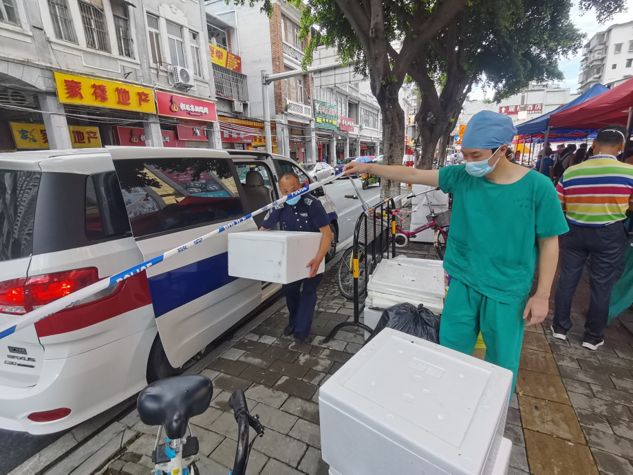 荔灣區(qū)市場監(jiān)管人員身穿防護服在涉疫重點街道協(xié)助核酸檢測