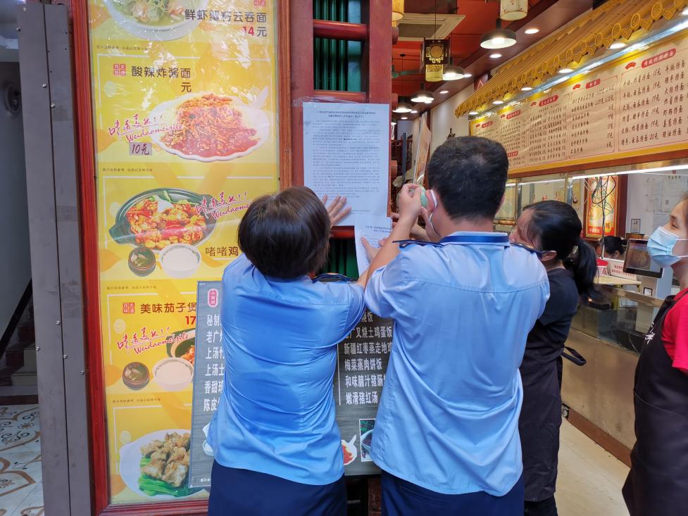 荔灣區(qū)市場監(jiān)管局執(zhí)法人員張貼禁止堂食通知