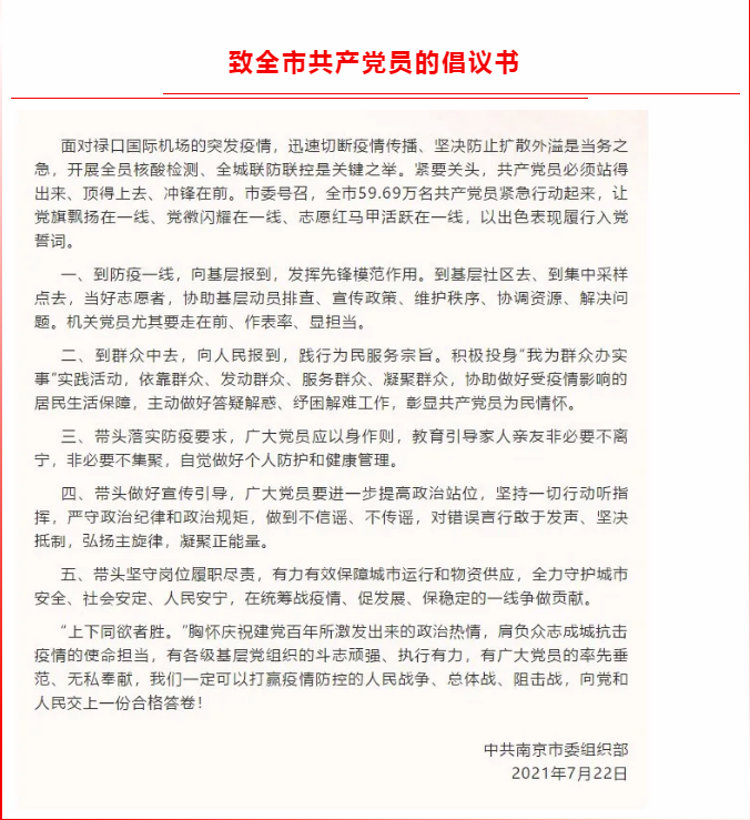 中國質(zhì)量新聞網(wǎng)訊 2021年7月20日,江蘇省南京市祿口國際機場疫情發(fā)生后,市委市政府高度重視,第一時間明確各項防控措施,從嚴快速抓好落實。22日當天,市委組織部發(fā)出了《致全市共產(chǎn)黨員的倡議書》。對于全市市場監(jiān)管干部而言,這不僅僅是一封倡議書,更是一道全力保障南京打贏疫情阻擊攻堅戰(zhàn)的集結(jié)號聲!