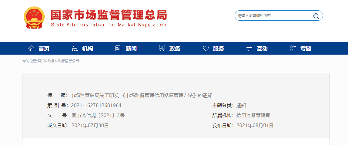 市場(chǎng)監(jiān)管總局關(guān)于印發(fā)《市場(chǎng)監(jiān)督管理信用修復(fù)管理辦法》的通知