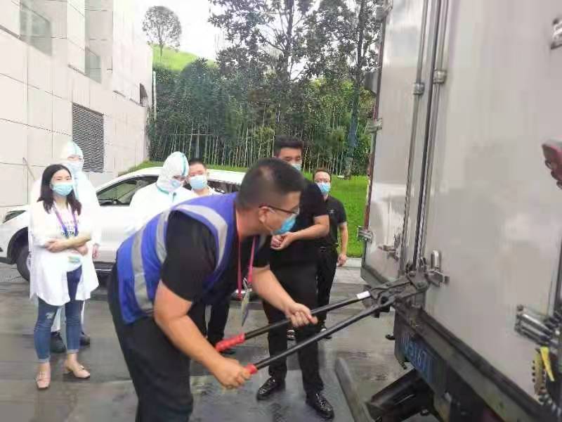 食材裝上車(chē),他和司機(jī)各自給每輛車(chē)的貨物箱門(mén)上上鎖,再加上鉛封。這時(shí)還要用力再拽拽。