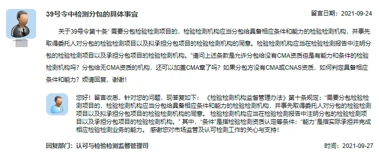 近期,有網友在市場監(jiān)管總局網站公眾留言系統(tǒng)咨詢“39號令中檢測分包的具體事宜”,市場監(jiān)管總局認可與檢驗檢測監(jiān)督管理司給予了答復。