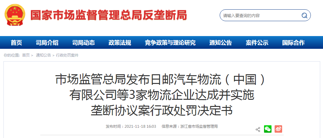 原浙江省工商行政管理局于2018年7月對(duì)日郵汽車物流(中國)有限公司、寧波藍(lán)盾志御國際物流有限公司、天門市三邦物流有限公司涉嫌壟斷協(xié)議行為立案調(diào)查,2021年10月,浙江省市場(chǎng)監(jiān)督管理局對(duì)本案作出行政處罰決定,現(xiàn)予公告。
