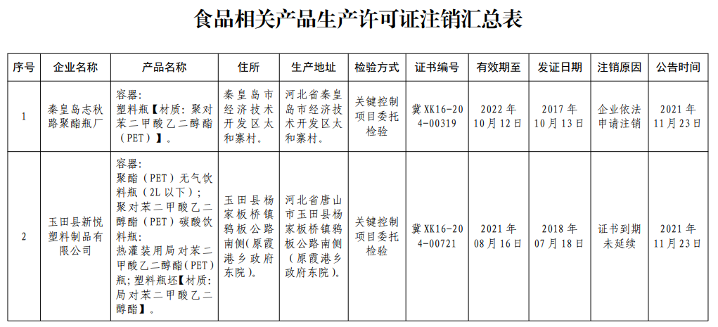 根據(jù)《中華人民共和國行政許可法》《中華人民共和國工業(yè)產(chǎn)品生產(chǎn)許可證管理條例實施辦法》《市場監(jiān)督管理行政許可程序暫行規(guī)定》等法律法規(guī),秦皇島志秋路聚酯瓶廠等2家企業(yè)相應(yīng)的食品相關(guān)產(chǎn)品生產(chǎn)許可事項符合注銷條件,現(xiàn)予以注銷。