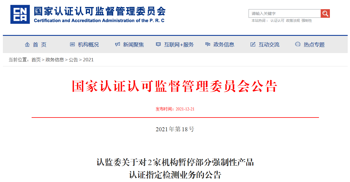 認(rèn)監(jiān)委關(guān)于對(duì)2家機(jī)構(gòu)暫停部分強(qiáng)制性產(chǎn)品認(rèn)證指定檢測(cè)業(yè)務(wù)的公告