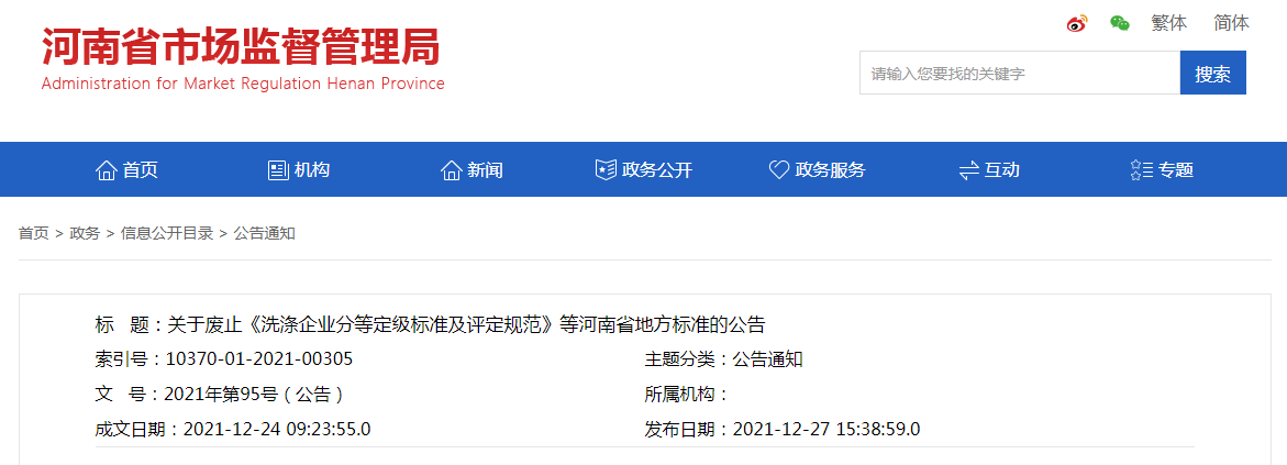 關(guān)于廢止《洗滌企業(yè)分等定級標(biāo)準(zhǔn)及評定規(guī)范》等河南省地方標(biāo)準(zhǔn)的公告